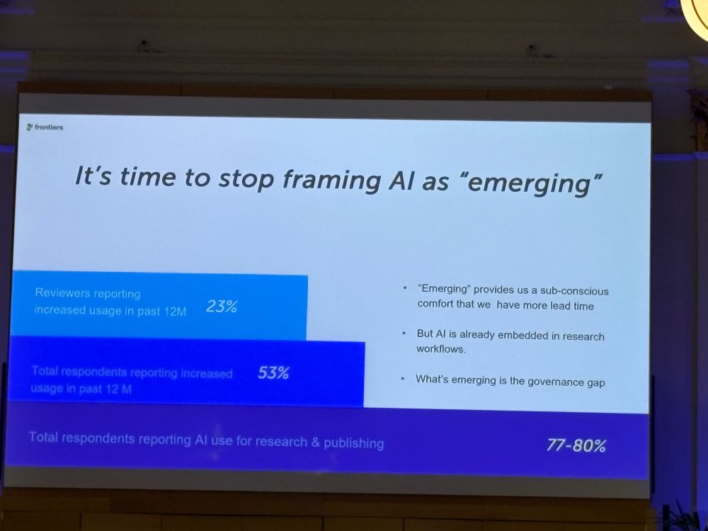 This data from METR points to some important themes which emerged from three excellent plenary talks during R2R. Firstly, as Simone Ragavooloo (Frontiers) urged us to recognise in her presentation on responsible AI adoption, we are a long way past AI being an ‘emerging’ technology to which we still have time to adapt as an industry (Figure 1 is a screenshot from Simone’s presentation). It is already embedded in everyday lives and increasingly in business processes. It is not going to go away.