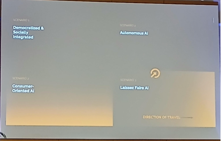 Secondly, the speed of AI progression in an increasingly unregulated commercial environment reinforces the feeling that we are at the mercy of the AI tech bros and their governmental sponsors. As things stand, this does seem like the most likely direction of travel. Keith Webster (Carnegie Mellon University) described four potential futures for AI which he has been tracking over the last decade or so (see Figure 2 from Keith’s presentation).